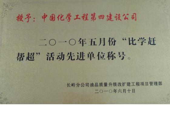 在隨后的“4.30”控制點和“5.20”控制點施工中,項目部精心組織施工、日夜奮戰(zhàn)、齊心協(xié)力,順利完成了這兩個控制點,贏得業(yè)主和監(jiān)理的一致贊揚,在長煉樹立起四化建這面旗幟。在2010年4月,業(yè)主組織開展的“比學趕幫超”活動中,項目部從20多家參建單位中脫穎而出,榮獲了“文明工區(qū)獎”、“比學趕幫超活動先進單位”、“質(zhì)量樣板”、“HSE先進工地”四個獎項。在2010年5月,項目部又再次榮獲“比學趕幫超”活動先進單位。在施工中,先后有付承、張治冬、丁振華、周葵花、肖小健和劉立新獲得業(yè)主授予的“優(yōu)秀焊工”獎,朱文捷、李衛(wèi)紅兩人獲業(yè)主授予的“HSE”先進個人。