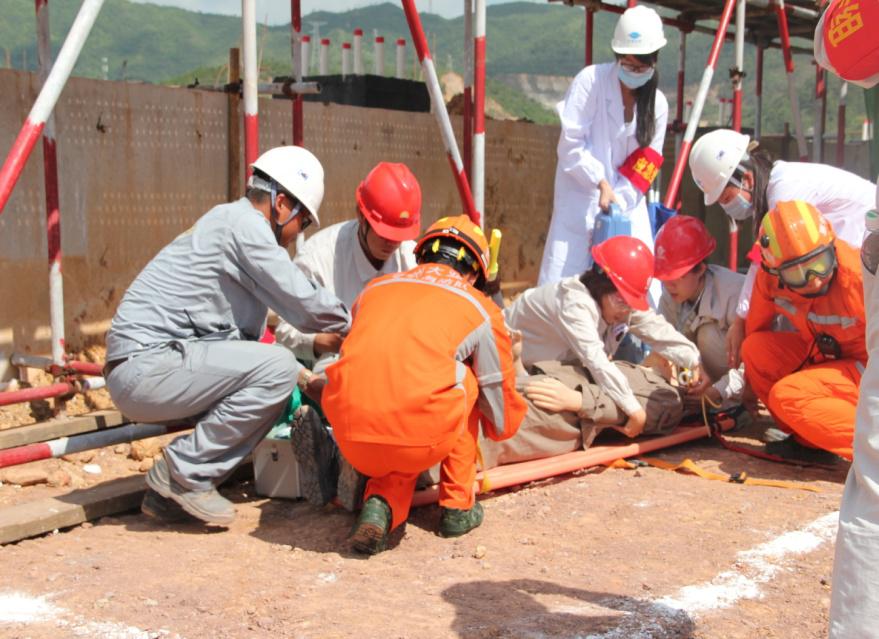 演練場(chǎng)景為硫磺庫棚東側(cè)腳手架有一人在約4米高處觸電后從高處墜落。發(fā)現(xiàn)事故后,項(xiàng)目部安全監(jiān)護(hù)人員及時(shí)上報(bào),現(xiàn)場(chǎng)專職安全員劉占洋撥打救援電話,并上報(bào)應(yīng)急總指揮。總指揮齊少華啟動(dòng)項(xiàng)目部“1號(hào)應(yīng)急預(yù)案”。應(yīng)急救援組李小蘭、王亞萌等進(jìn)行傷者救護(hù),安全保障組張小民組織緊急集合,后勤保障組彭井恩帶隊(duì)進(jìn)行警戒圍護(hù),季信軍、高鐵騎救護(hù)車輛指引。應(yīng)急小組分工明確,各司其職,救援、警戒、緊急集合同時(shí)進(jìn)行,傷者救護(hù)在10分鐘內(nèi)將傷者送往醫(yī)院救治。