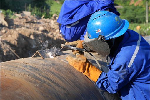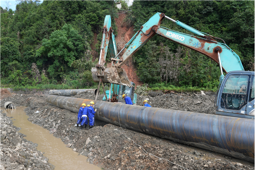 下午13:00,應急搶險突擊隊抵達平江后,隨即爭分奪秒展開搶險修復工作。隊員們頂著高溫和烈日,30分鐘完成現(xiàn)場踏勘,確定施工方案,并著手對13根12米長的DN1200管道進行對口、點焊、焊接、下管,全面開展搶修工作。
