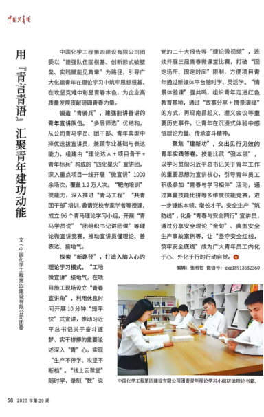 近日,由共青團中央主管主辦的工作指導刊物《中國共青團》2025年第20期專版刊載了中國化學工程四化建青年理論學習工作經驗文章《用“青言青語”匯聚化建青年建功動能》,對公司用黨的創新理論賦能青年成長、用黨的初心使命引領青年建功的創新路徑進行專題報道,為央企青年思想政治引領工作蓬勃發展提供了可復制、可推廣的實踐樣本。