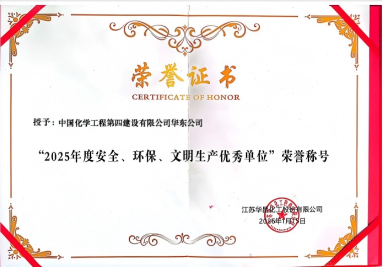近日,由華東公司承建的張家港華昌DYC項目,被業主江蘇華昌化工股份有限公司授予“2025年度安全、環保、文明生產優秀單位”榮譽稱號。