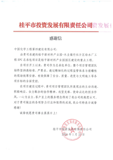 近日,公司收到桂平市投資發展有限責任公司發來的感謝信,對華南公司承建的桂平新材料產業園木圭鎮竹社片區給水廠工程EPC總承包項目給予高度評價,并對項目團隊展現出的專業素養與擔當精神表示衷心感謝。
