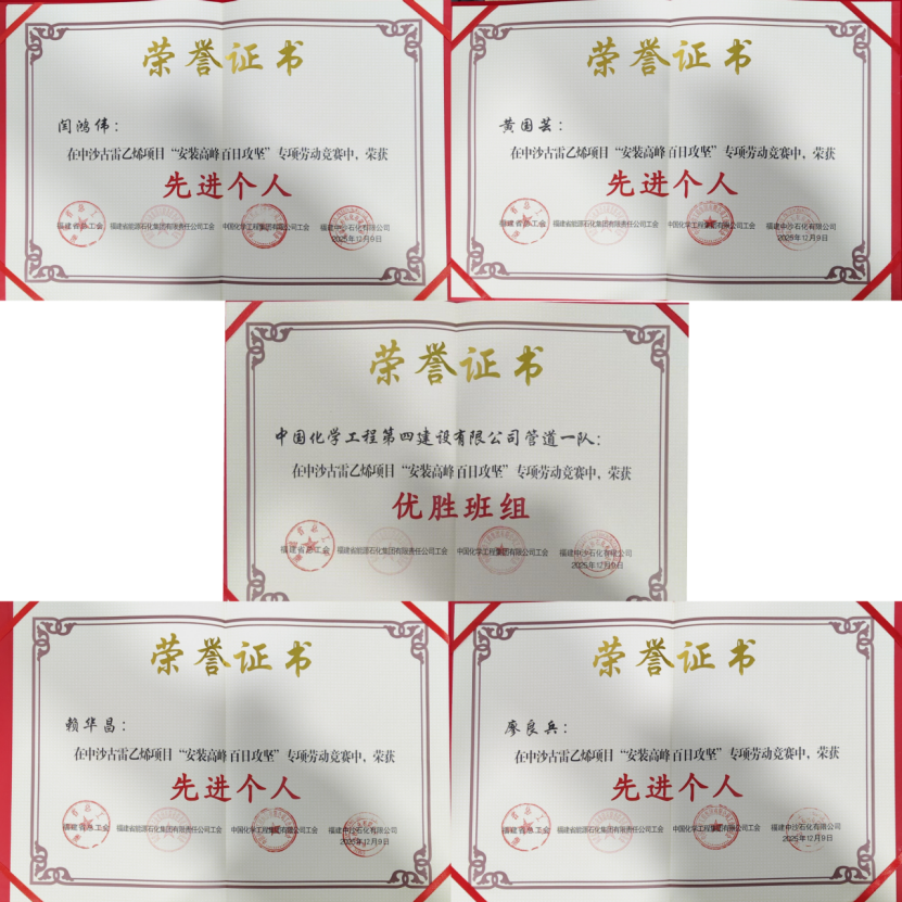 近日,在中沙古雷乙烯項目引領性勞動競賽2025年度總結暨創新成果交流活動中,中國化學工程第四建設有限公司華南公司中沙古雷項目部管道一隊榮獲“優勝班組”稱號,黃國蕓、賴華昌、廖良兵、閆鴻偉等4名員工榮獲“先進個人”稱號。