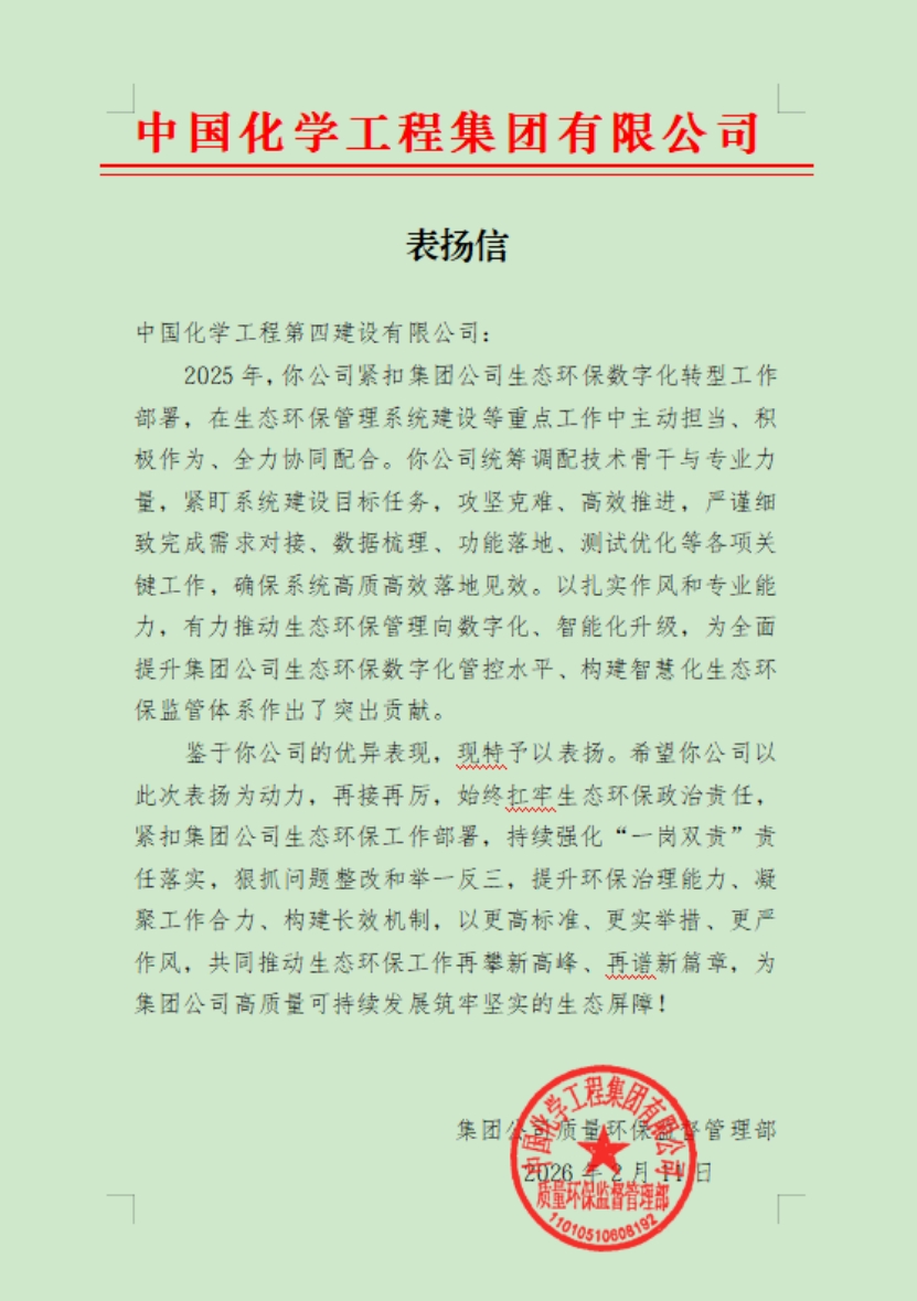 近日,中國化學工程第四建設有限公司收到中國化學工程集團有限公司質量環保監督管理部發來的表揚信,對公司在2025年度生態環保數字化轉型工作中的積極貢獻與推進成效給予充分肯定。