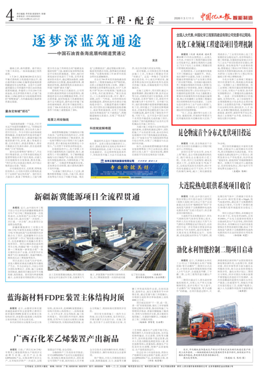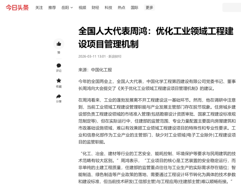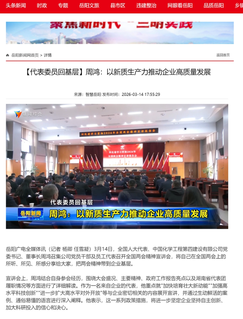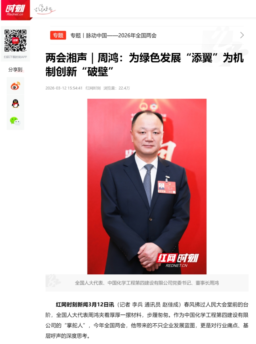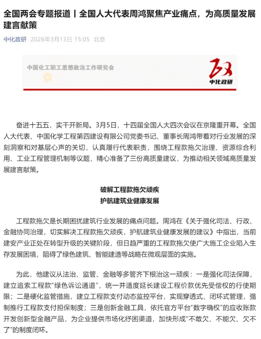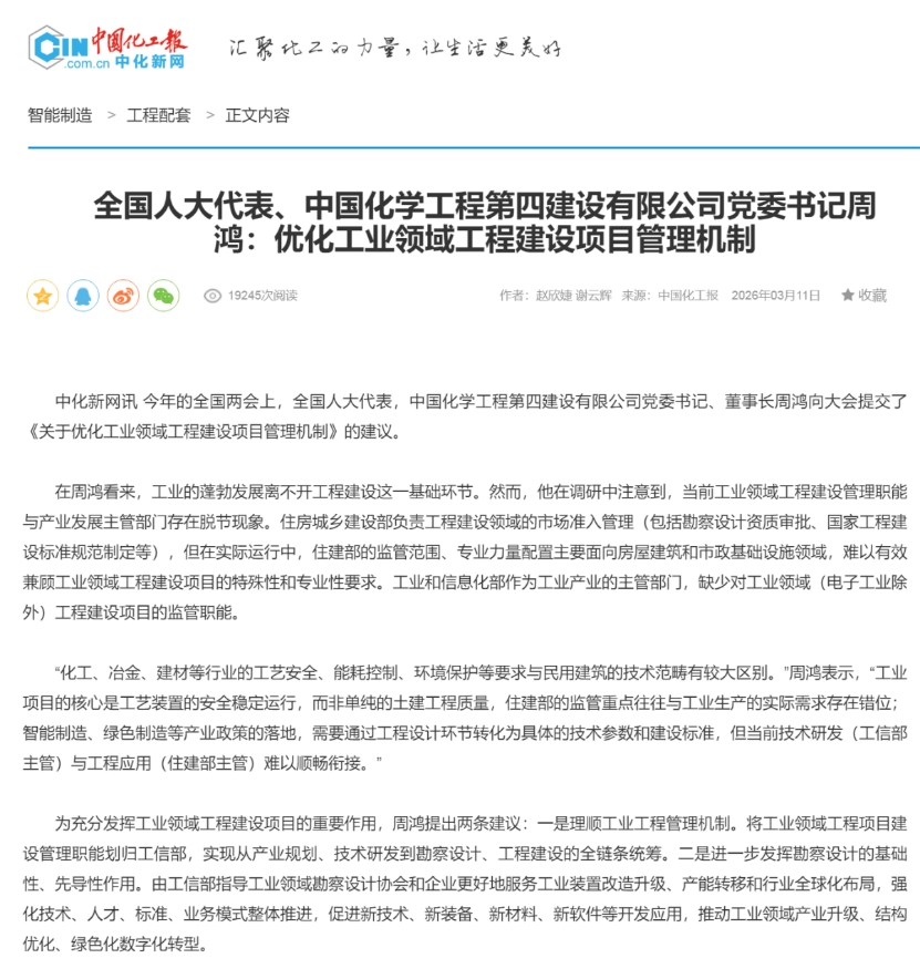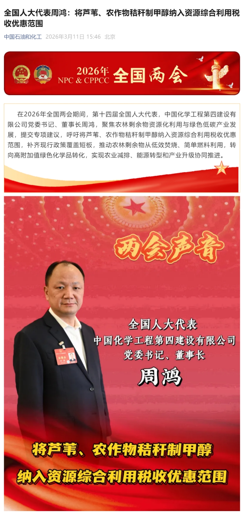 春風送暖,萬象更新。2026年全國兩會勝利閉幕,“十五五”開局的號角響徹神州大地。會議期間,全國人大代表,中國化學工程第四建設有限公司黨委書記、董事長周鴻認真履行憲法和法律賦予的神圣職責,積極建言獻策,圍繞工業領域工程建設項目管理機制優化、工程款拖欠頑疾治理、蘆葦秸稈制甲醇納入稅收優惠等熱點難點問題,提交了3份沉甸甸的建議。