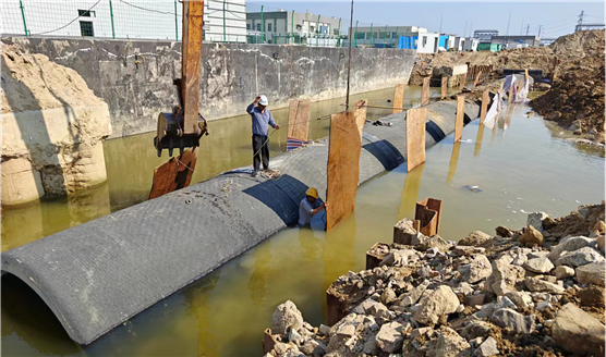 該雨水管道施工區(qū)域位于水下,管中線離海水僅有20米并與海相通,管道安裝難度大;同時,在開挖過程中,取水箱涵上面出現(xiàn)大量海水涌入導致土層坍塌。面對緊急情況,項目部連夜探討解決管道水中定位與對接問題,積極會商業(yè)主、監(jiān)理單位,積極探索解決問題的路徑和方法,最后決定因“水”制宜,采取水下澆注混凝土來解決此難點。施工人員在箱涵上方處,通過對預(yù)應(yīng)力鋼筒混凝土管兩端頭進行預(yù)制管枕施工,淤泥層及碎石處采取預(yù)制閥板墊層,挖集水坑進行強排,并且全程用GPS和全站儀進行精確測量標高和定位,確保雨水管道安裝的準確性和穩(wěn)定性,順利完成管道水中施工作業(yè)。