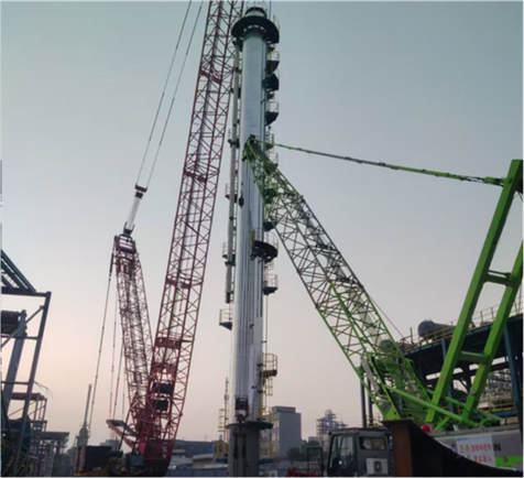此次吊裝的異乙烷塔的規格為Φ2800×47100、設備自重102噸,乙烷塔的規格為Φ2200×38500、設備自重69噸,是項目的關鍵設備。為安全順利完成此次設備吊裝,項目部充分發揮專業優勢,根據實際情況制定周密吊裝方案,做實安全技術交底,合理調配人員、機械;組織技術人員提前對設備本體及設備基礎與圖紙詳細比對。在吊裝中,吊裝人員通力合作,克服現場環境復雜、設備體積大、作業空間有限等困難,采用400噸履帶吊主吊、150噸履帶溜尾的吊裝方法,兩臺設備均一次吊裝成功,受到現場觀摩的長煉興長集團副總經理蔡贊和岳陽綠色化工園區有關領導的高度贊揚。