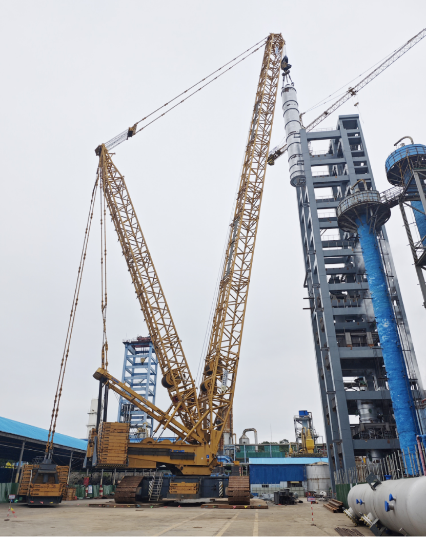 作為華強(qiáng)化工尿素生產(chǎn)線的“心臟”設(shè)備與整個升級改造工程的核心樞紐,此次吊裝的尿素合成塔高27.5米、直徑3米,其安裝精度直接關(guān)乎裝置投用后的運行效能。為了確保一次順利將這臺核心設(shè)備吊裝成功,項目部前期反復(fù)論證、優(yōu)化專項方案,最終確定采用“雙機(jī)抬吊”工藝:以1250噸履帶吊為主吊設(shè)備,搭配900噸汽車吊協(xié)同溜尾作業(yè),精準(zhǔn)匹配設(shè)備重量與現(xiàn)場工況。同時,項目部始終將“安全第一”貫穿全程,吊裝前嚴(yán)格開展吊索具全面檢查,科學(xué)劃定警戒區(qū)域,明確各崗位操作規(guī)范,全程實時監(jiān)控吊裝姿態(tài)與受力情況,最終實現(xiàn)設(shè)備“零誤差”精準(zhǔn)落位,整個作業(yè)安全高效、一氣呵成。